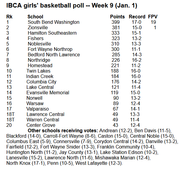 (1-1-23) Nothing changes this week in the IBCA girls basketball poll. South Bend Washington (17-0) picks up 19 of the 20 votes to remain #1, Zionsville (15-0) picked up one 1st poll to remain at #2.