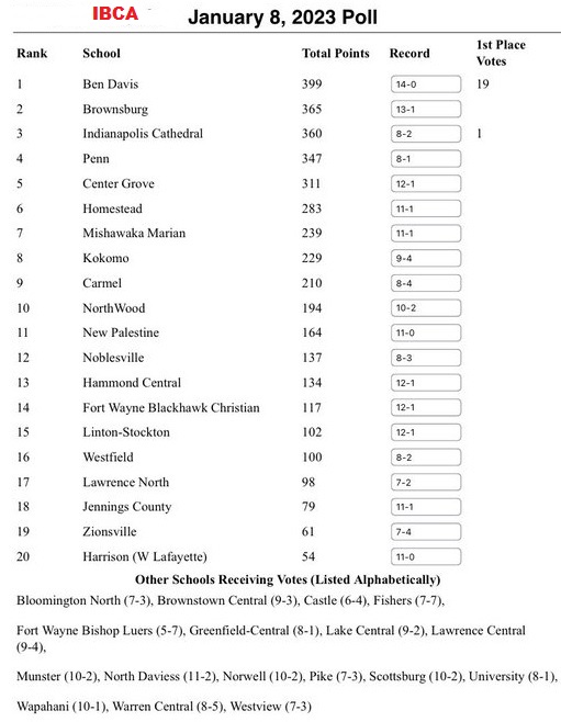 (1-8-23) Ben Davis (14-0) remains #1 in the latest IBCA Boys Basketball poll, although they lost one 1st place vote to Indianapolis Cathedral who is ranked #3, after being ranked #2 last week. Brownsburg (13-1) is now #2 this week.