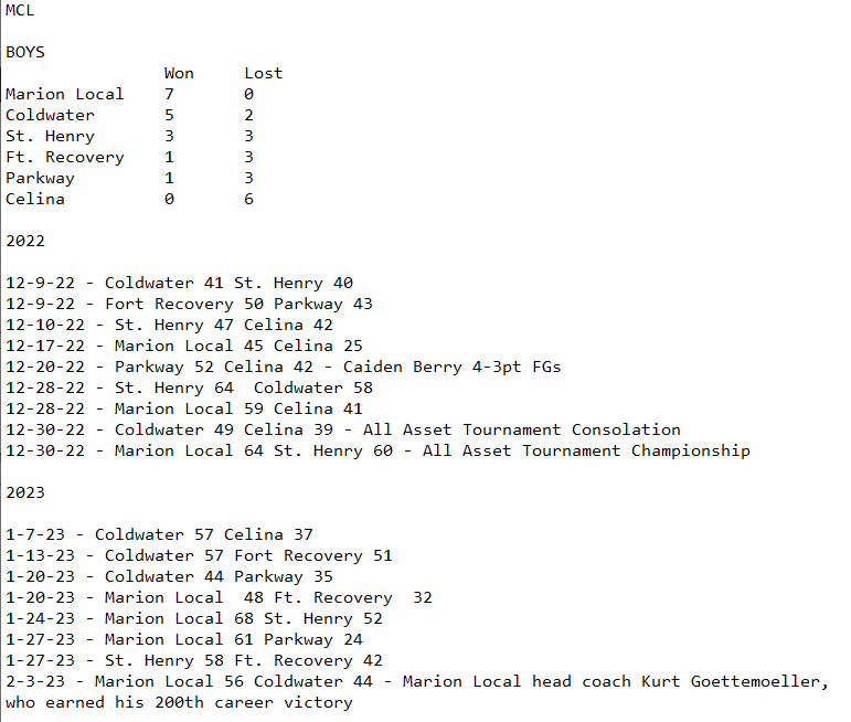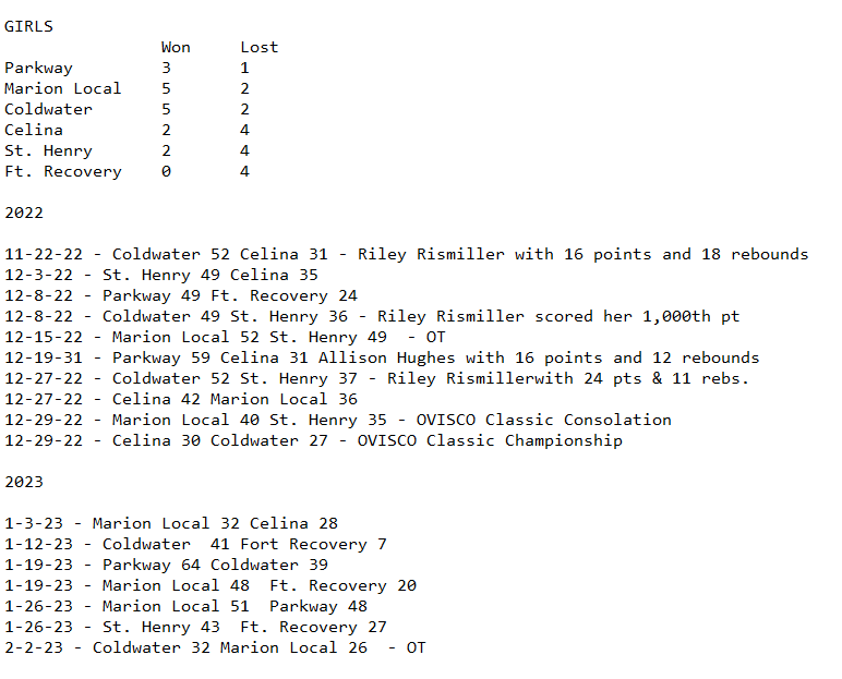 In girls basketball…a win this past week by Coldwater in OT over Marion Local gives Parkway new life and the opportunity to win its first outright MCL title. The Panthers will face St. Henry on Thursday and a win will give them the title (based on MCL guidelines). A loss will give Parkway, Coldwater and Marion Local a share of the title.