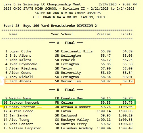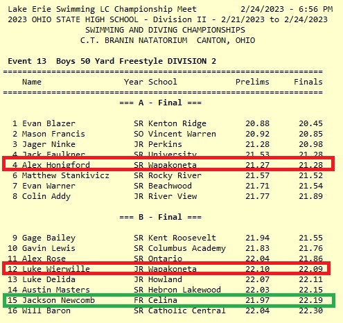 (2-24-23) Celina Freshman Jackson Newcomb ends the season at the OHSAA Swimming and Diving State Championships with a 15th place finish in the 50m freestyle and an impressive 10th place finish in the 100m breaststroke.