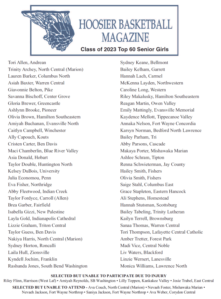 girls basketball, Indiana, Uncategorized HOOSIER BASKETBALL MAGAZINE TABS TOP 60 SENIOR GIRLS Date: February 28, 2023Author: statelinesportsnetwork 0 Comments Kelham, Double and Schwieterman Fordyce, Stephens and Vice Economou, Stahl and Brooke Share this: Click to share on X (Opens in new window) X Click to share on Facebook (Opens in new window) Facebook Like Loading...