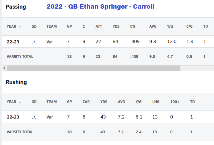(3-3-23) Last season Carroll went to the IHSAA 4A State Football Championship game, The Chargers entered the game undefeated thanks to Homestead transfer Sophomore QB Jimmy Sullivan…they lost to Center Grove 35-9. Sullivan would be injured in the 4th quarter and that is when back-up Jr QB Ethan Springer entered the game, at 3:02 he would throw the Chargers only TD of the day a 26 yard pass to Camden Hershberger.