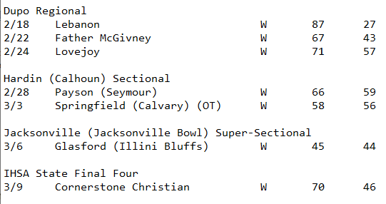 (3-9-23) Last year Scales Mound lost in the IHSA Class A State Semifinal game, not wanting to repeat that and play the 3rd place game tonight the Hornets picked up a 40-27 win over Tuscola. That will give them the chance to win a state title on Saturday at 11 am back in Champaign when they play Gibault Catholic (31-7) who handled Cornerstone Christian 70-46 in the 1st semifinal game.