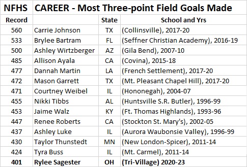 In the process Sagestar entered some national ‘rarefied air‘ when she made three 3PT FGs, she is already Ohio’s all-time career leader, but with a career total of 401, made after yesterday, she enters the all-time NFHS line-up. Sagester is now 1 of 14 to have made 400 or more career 3 PT FGs. When you look at that accomplishment it is a true sign of one of Ohio’s top players to come out of the state.