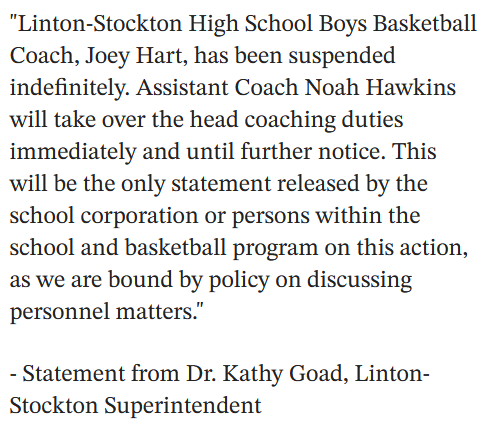 (3-14-23) Shelbyville (Indiana) Police arrested Linton-Stockton boys basketball coach Joey Hart (50) Monday night on a charge of operating a vehicle while intoxicated. OWI is a Class A misdemeanor, which carries a possible sentence of up to a year in jail.