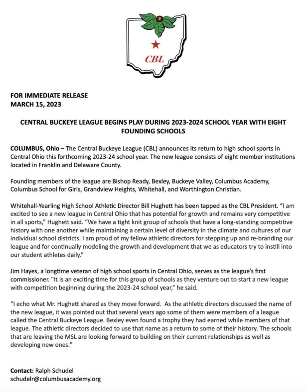 (3-16-23) An old name a new league…the Central Buckeye League (CBL) will start competition in the fall. It is quite a mixture of schools…public schools, Catholic school member, Christian school member and two private schools.