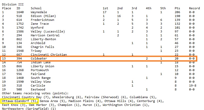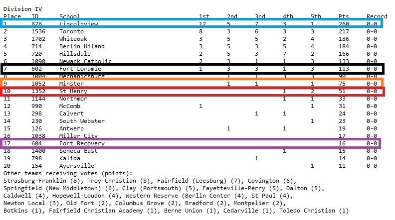 Two Stateline area teams are ranked #1, in D IV the Northwest Conference’s Lincolnview Lancers takes the top spot with 12 1st place votes. Other local teams Ft. Loramie is #7, Minster #9, St. Henry #10 and Ft. Recovery #17.