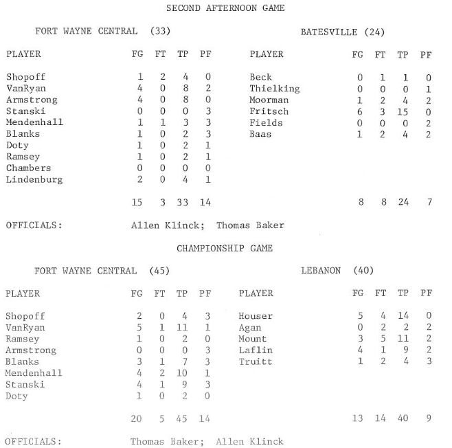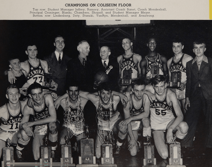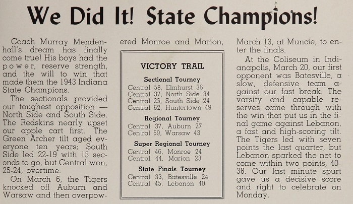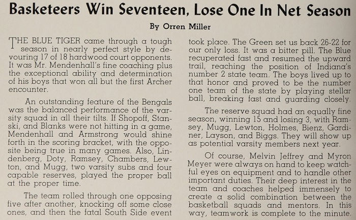 The Tigers were led by Hall of Fame Coach Murray Mendenhall who during his high school coaching career won 418 games and lost 153 during 23-year high school coaching career …coached 4 sports at Fort Wayne Central, winning state basketball championship in 1943…won 10 sectionals, 8 regionals, and 4 semistate