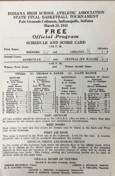 (3-24-23) In 1943 World War II was still in progress, but that did not stop ‘Hoosier Hysteria‘ from keeping high school basketball fans entertained. Ft. Wayne Central would win the IHSAA 1943 single-class title that was played at the Indianapolis Coliseum. The Tigers would beat Batesville in the afternoon game 33-24 and coming back that night to win the championship game over Lebanon 45-40.