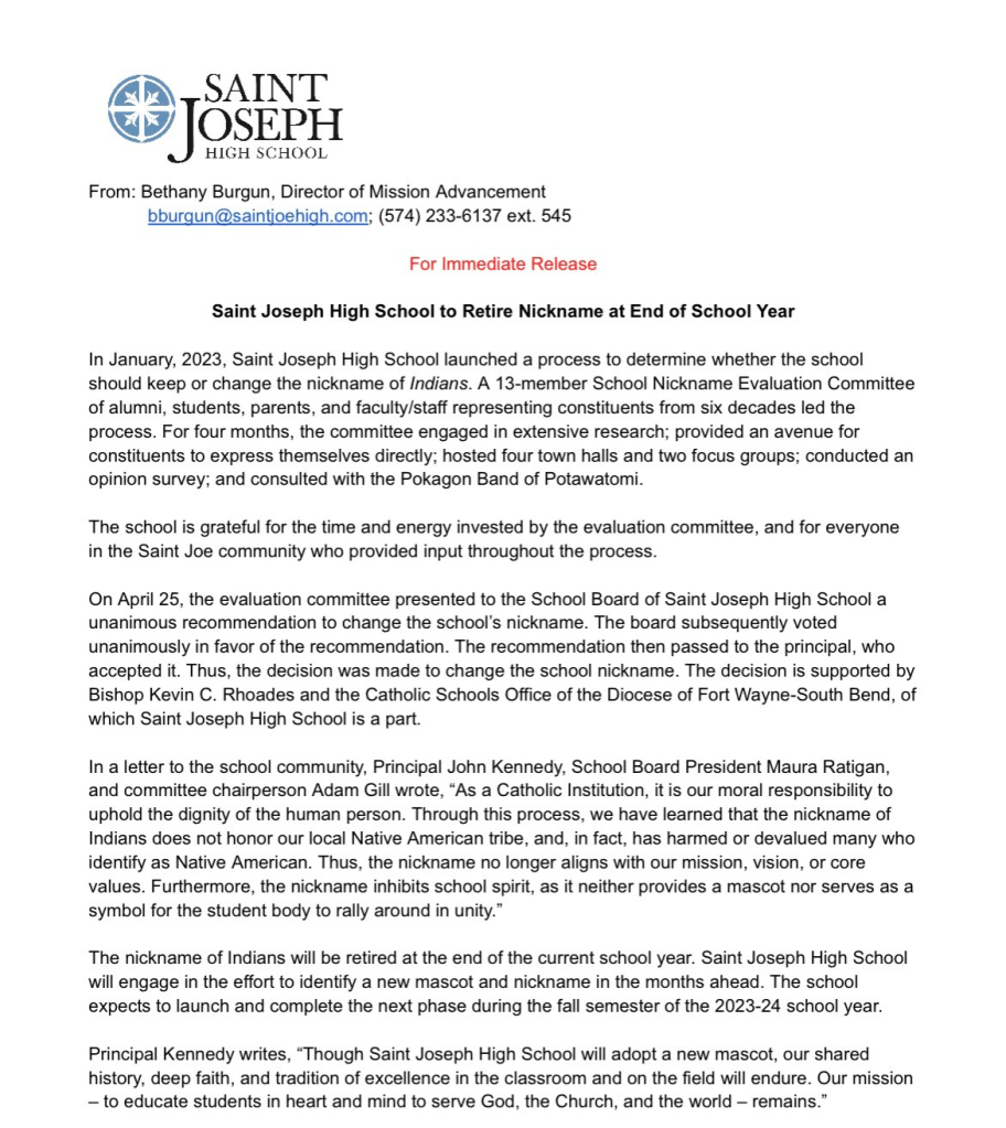 (5-2-23) One less Native American high school mascot will not be around Indiana in the upcoming fall… after South Bend St. Joseph announced they would be retiring ‘Indians’ as the school’s mascot.