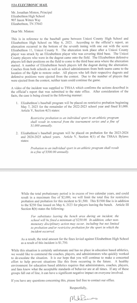 Below is a letter that was emailed to the TSSAA from Elizabethton Principal Jonathan Minton—