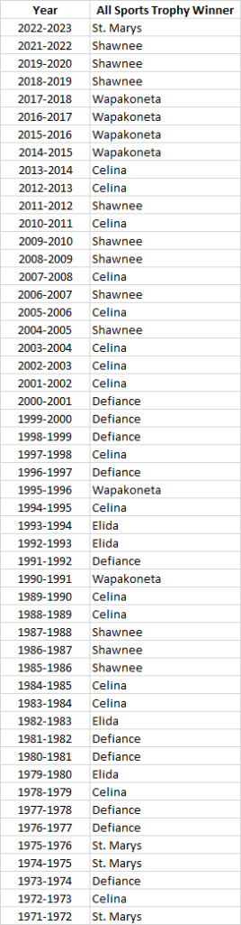 (5-23-23) The Western Buckeye League (WBL) announce that the St. Marys is this year’s winner of the Superior Credit Union Western Buckeye League All Sports Trophy. It is the fourth time St. Marys has won the trophy and the first time since the 1975-76 school year.
