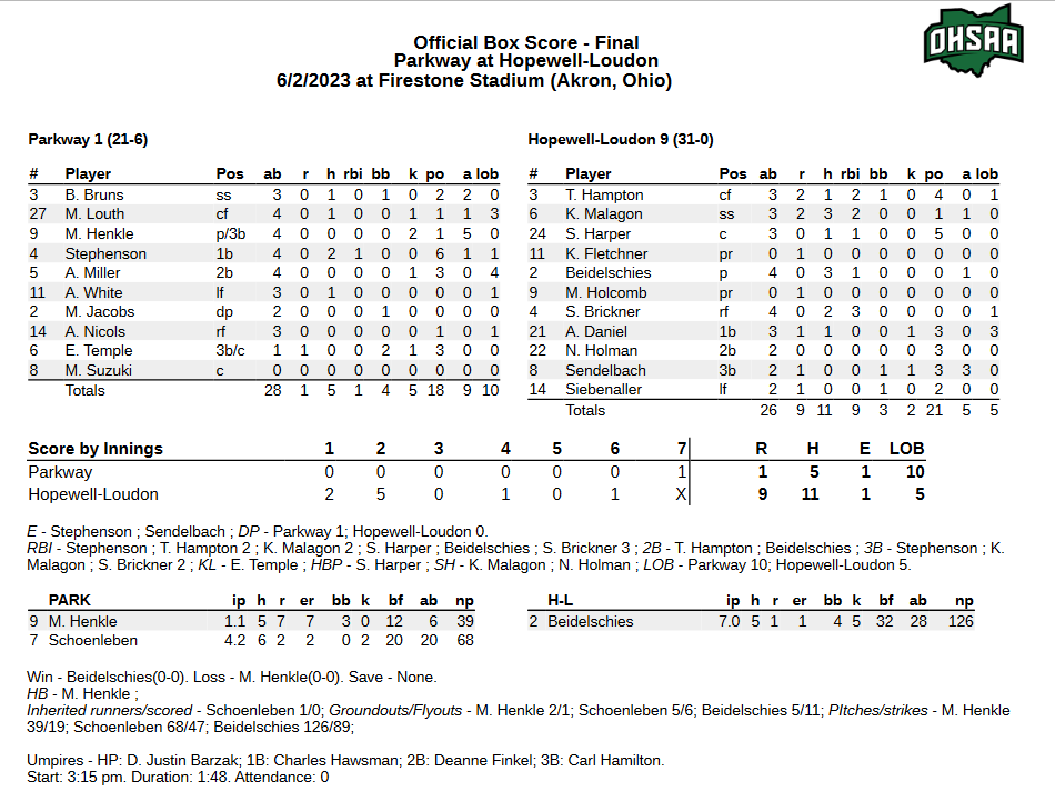 (6-2-23) Hopewell-Loudon scored early and often to advance to the D IV Softball state title game tomorrow after a 9-1 semifinal win over Parkway.