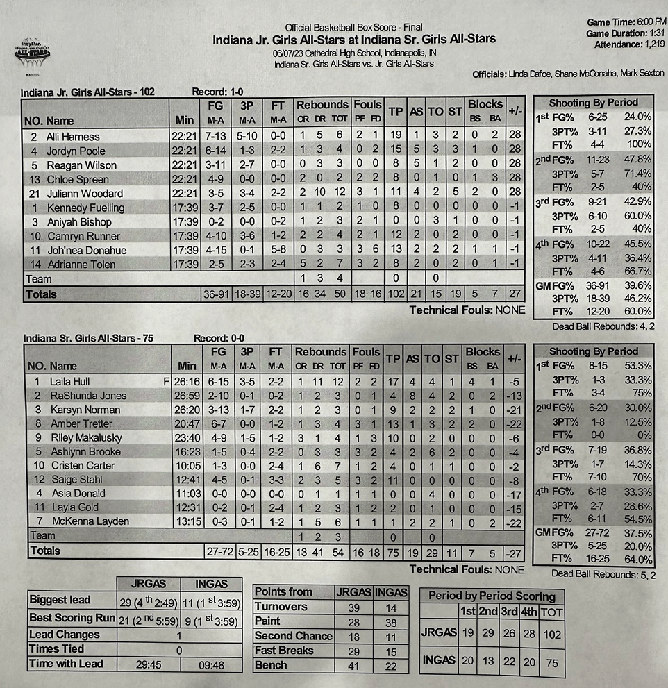 (6-7-23) The Battle of Indiana All Stars took place tonight in Indianapolis at Cathedral High School as the Junior Stars took on the Senior Stars.