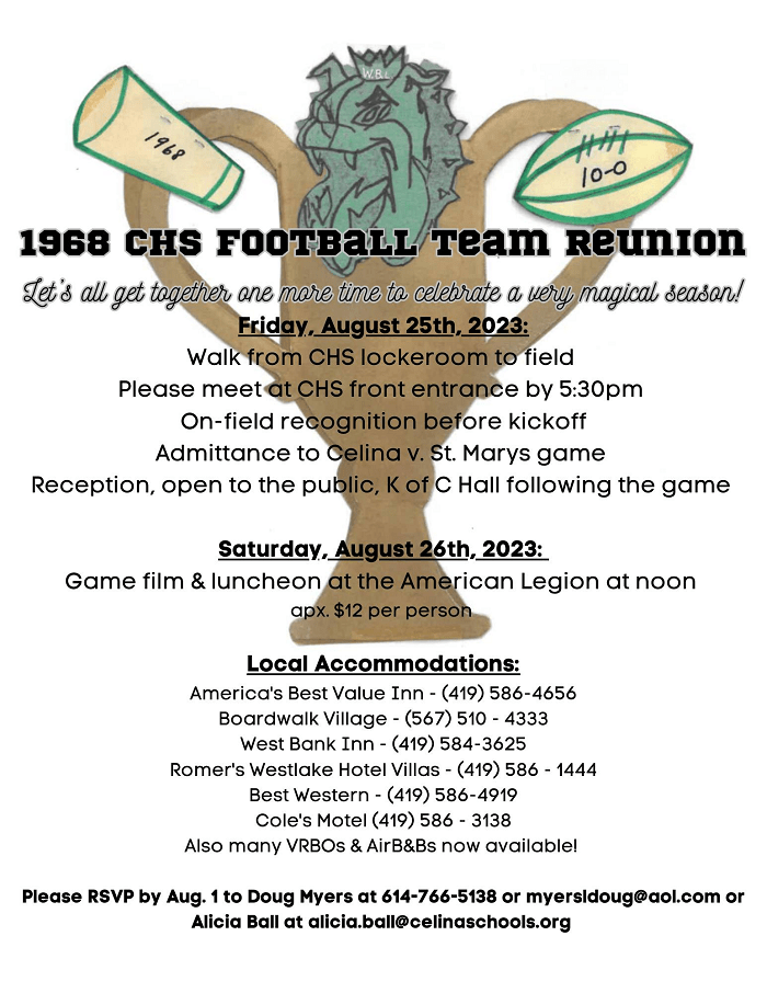 (6-25-23) 1968 in Celina football was a magic season when the Bulldogs went 10-0 and won the Western Buckeye League (WBL) title. There were no OHSAA playoffs at this time, but that didn’t matter it was for Bulldogs fans a year to remember.