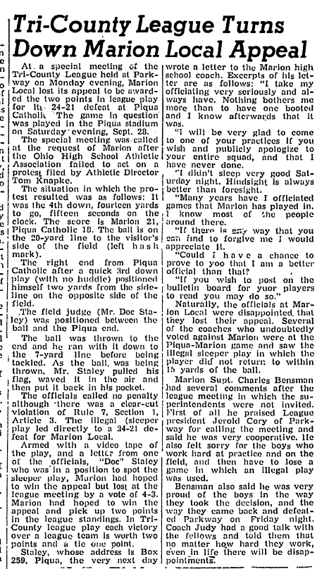 (6-25-23) In 1968 Marion Local tried to appeal a missed call in a Tri-County League football lost to Piqua Catholic.