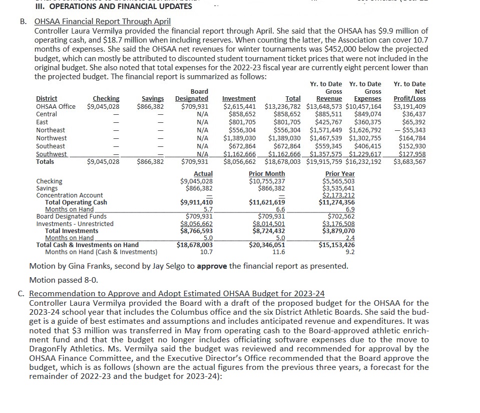 (6-30-23) The Ohio High School Athletic Association (OHSAA) held a special meeting on June 8th. The meeting included financial figures and the 2023-24 budget forecast.