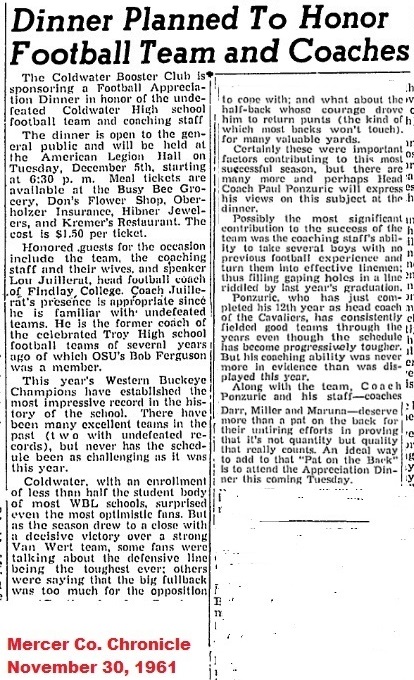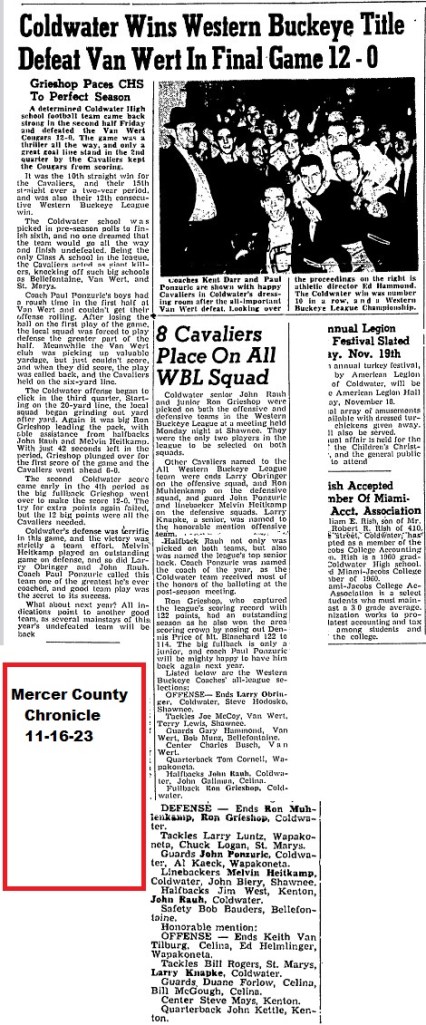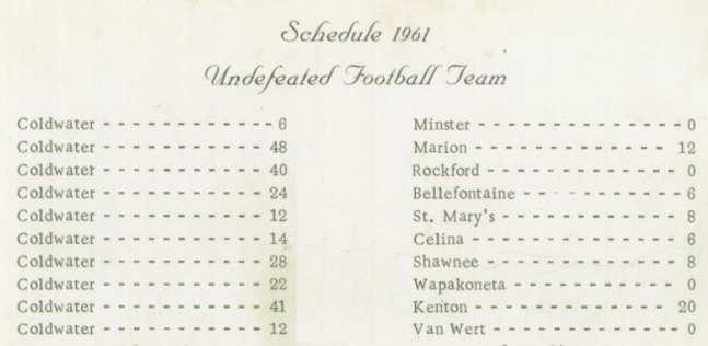 (7-5-23) Before moving to the Midwest Athletic Conference in 1973 the Coldwater Cavaliers were members of the Western Buckeye League. The Cavs joined the WBL in 1957-58, in just the third season competing in football in the WBL they went undefeated and won their one and only WBL football championship in 1961.