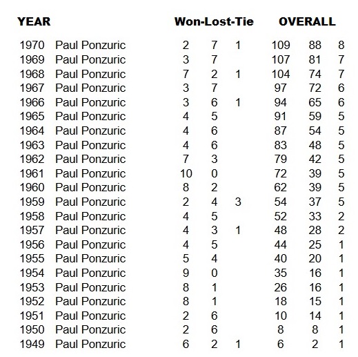 Pozuric won 109 games during his stay at Coldwater, he also led the Cavs to an undefeated season in 1954