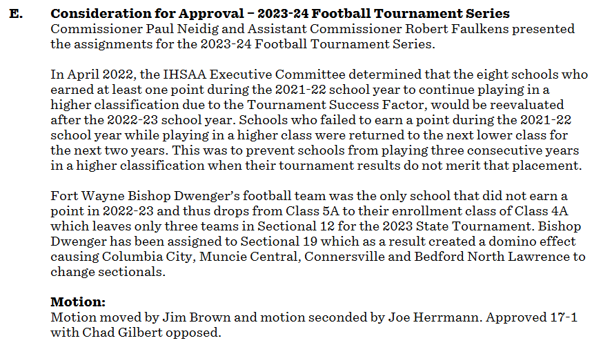 (8-24-23) During the August 22nd IHSAA Executive Committee meeting on a 17-1 vote Ft. Wayne Bishop Dwenger was moved down in football from Class 5A to 4A. The change comes as part of a tournament success factor that schools would be reevaluated after the 2022-23 school year. Schools who failed to earn a point during the tournament school year while playing in a higher class would be returned to the next lower class for the next two years. The Saints were the only school that qualified to move down after not earning a point last season.