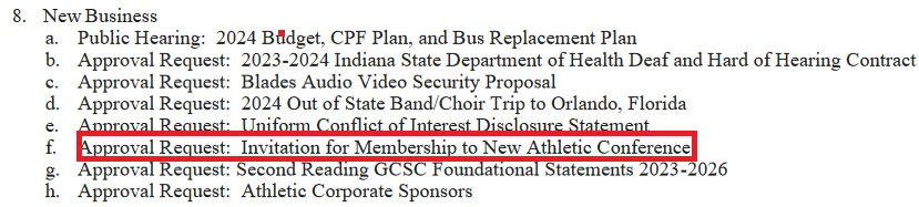 The Greencastle School Board approved the measure last night at its monthly meeting, accepting an invitation to join a new unnamed conference in the 2025-26 school year.