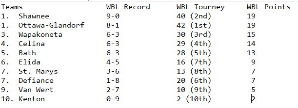 1. Shawnee 19, 1. Ottawa-Glandorf 19, 3. Wapakoneta 15, 4. Celina 14, 5. Bath 13, 6. Elida 9, 7. Defiance 7, 7. St. Marys 7, 9. Van Wert 5, 10. Kenton 2