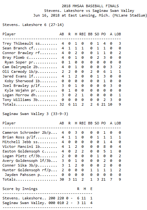 Saginaw Swan Valley 3, DeWitt 1 – Final Box