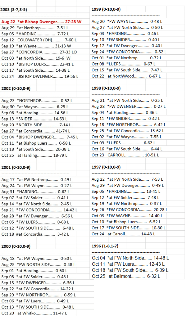 The Trojans streak started on October 4th 1996 losing to SAC rival Ft. Wayne North Side 48-14…the week before on September 26th they would win their last game over Concordia 26-17 before they would pick up their next win in 2003. Before that win they had lost 13 consecutive games.