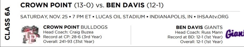 Division IV State Championship: Saturday, December 2, 7:30 p.m., Tom Benson Hall of Fame Stadium, Canton