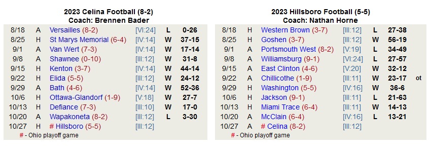 Hillsboro is 0-9 in playoff games (2022, 2020, 2018, 2005, 1998, 1996, 1995, 1994, 1992), while Celina is 7-8 in playoffs including a State Runner-Up finish in 1983. (2022, 2020, 2015, 1998, 1997, 1995, 1994, 1983 (2nd))