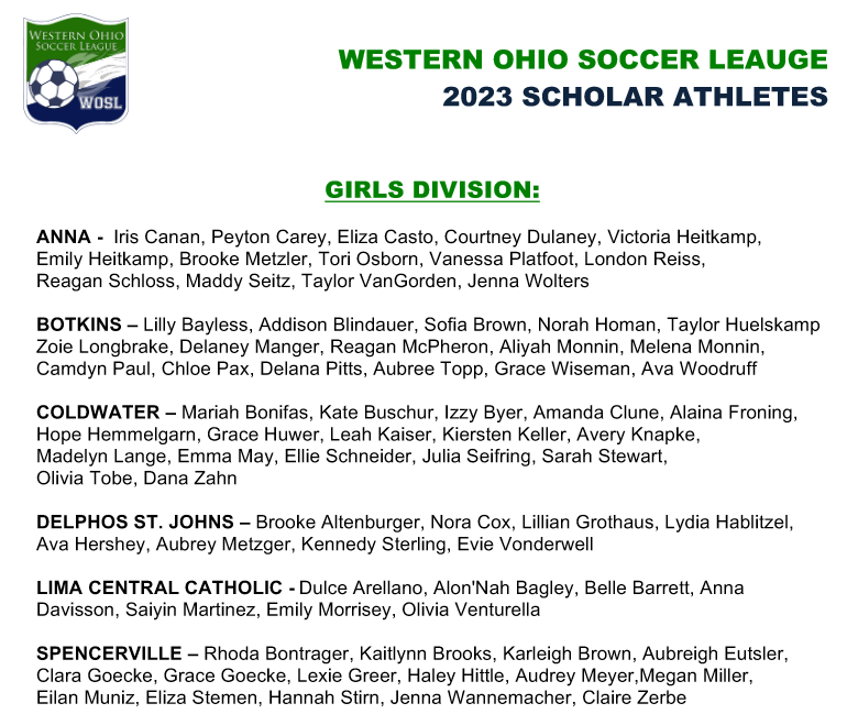 boys soccer, girls soccer, ohio, Uncategorized Western Ohio Soccer League Scholar Athletes for the 2023 Soccer Season Date: November 7, 2023Author: statelinesportsnetwork 0 Comments (11-7-23) Western Ohio Soccer League (WISL) Scholar Athletes for the 2023 Soccer Season Share this: Click to share on X (Opens in new window) X Click to share on Facebook (Opens in new window) Facebook Like Loading...