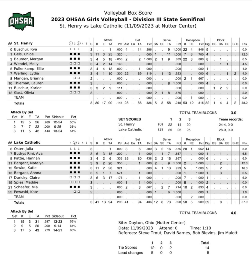 (11-9-23) St. Henry’s volleyball season came to an end today at the Nutter Center in the D III State Semifinal match losing to defending champion Lake Catholic 25-22, 25-14 and 25-20.