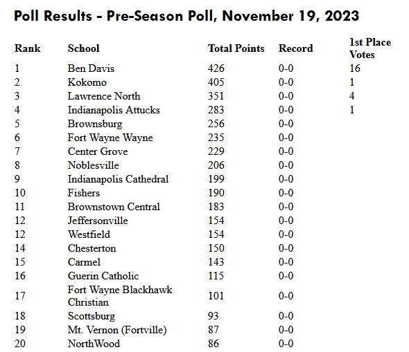 Below are results of the IBCA boys basketball pre-season poll (Nov. 19, 2023).