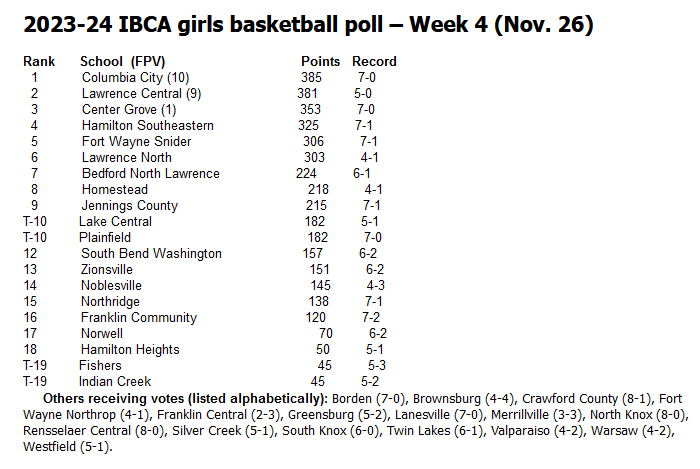 Below are results of the IBCA girls’ basketball poll for Week 4 (Nov. 26, 2023)
