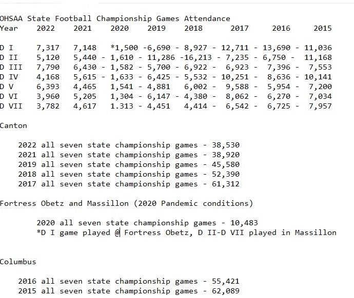 In 2018 the two teams played for the D II title in Canton and the attendance for that game was 16,123, the largest in the last 8 years. The last time over 10,000 were in attendance (11,286) for a game was 2019 when Massilon played Cincinnati LaSalle in the D II Final.