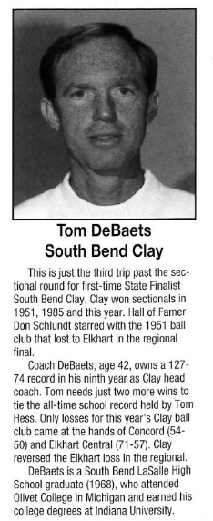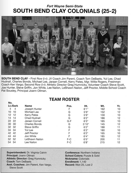 South Bend Clay, coached by Tom DeBaets, overcame a ten-point deficit in the final 1:36 of regulation time to capture the 84th Annual Indiana High School Athletic Association Boys Basketball State Finals Tournament 93-88 over Valparaiso in overtime.