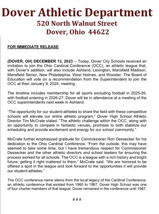 (12-13-23) The Dover Board of Education will consider membership in the Ohio Cardinal Conference at its January 8th meeting.