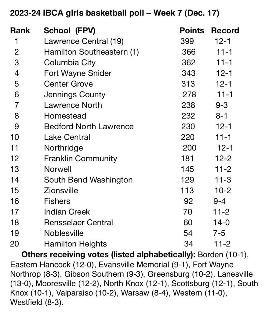 (12-17-23) Lawrence Central expanded its lead to remain #1 this week by picking up 4 more first place votes…and now have 19 of the 20 total votes. Hamilton Southeastern has the other #1 vote to remain at #2 and Columbia City is at #3.