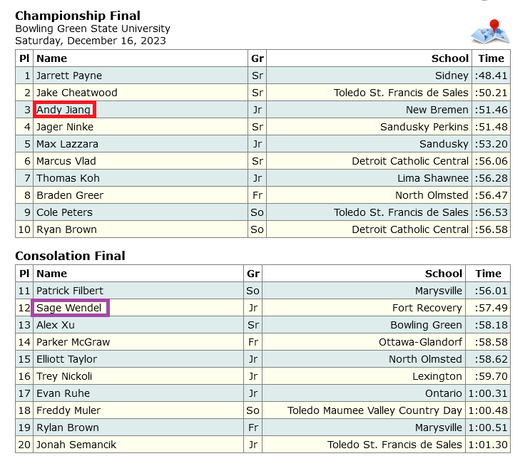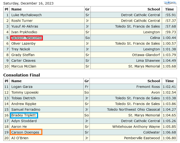 In the 50 butterfly Consolation Final St. Marys’ Bradey Triplett finished 16th overall and Coldwater’s Carson Doenges was 19th.