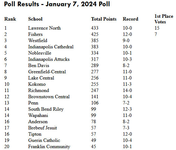 (1-7-24) Lawrence North (10-0) continues to hold the #1 spot in this week’s IBCA Boys Basetball Poll.