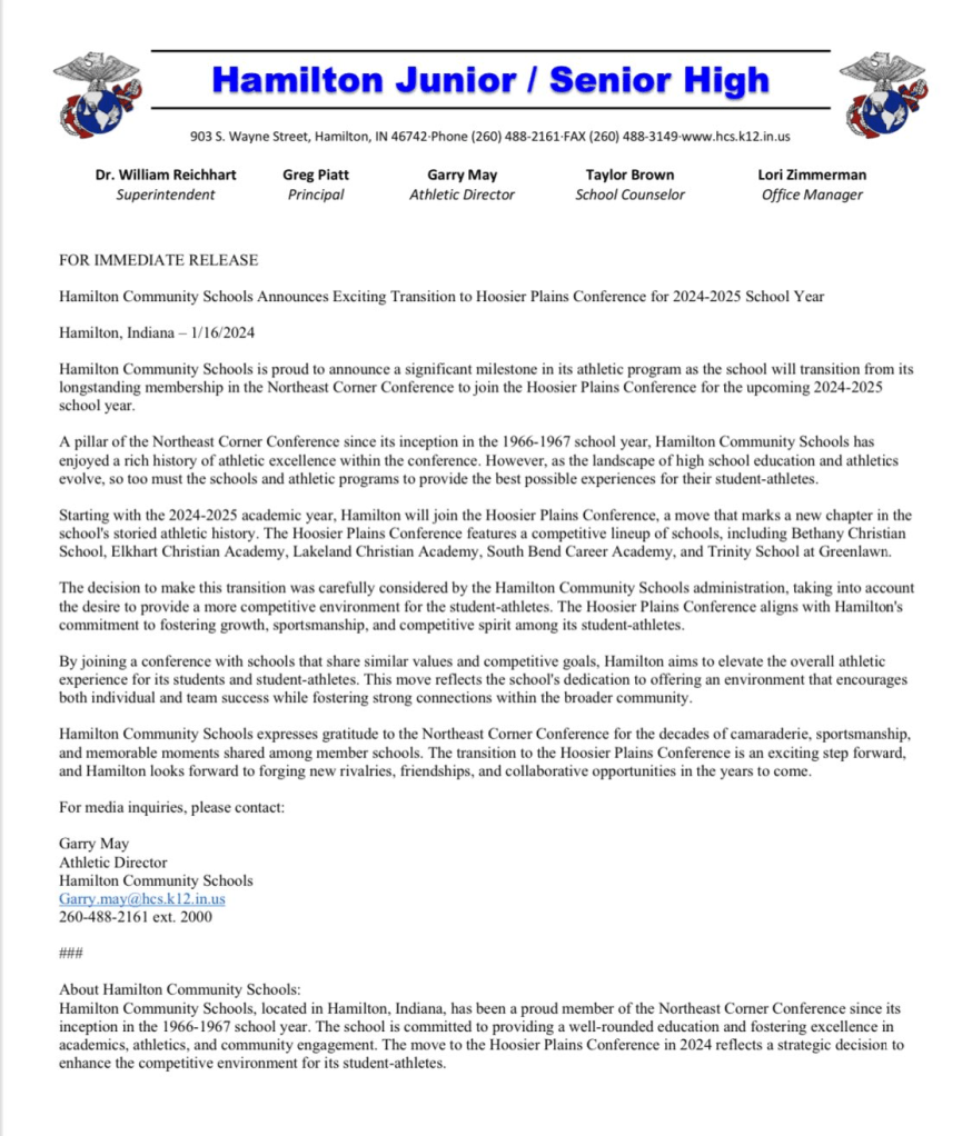 (1-16-24) Hamilton will leave the Northeast Corner Conference at the end of this school year and will join the Hoosier Plains Conference.