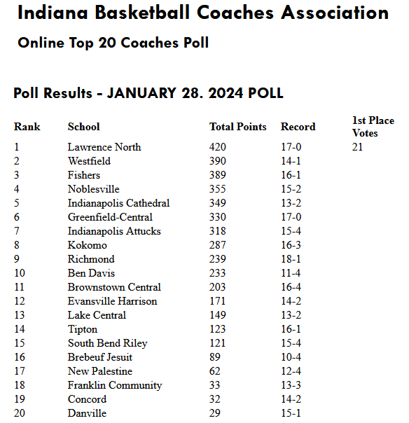 (1-28-24) Lawrence North picked up 21 1st place votes to take control of the IBCA Boys Basketball poll this week.