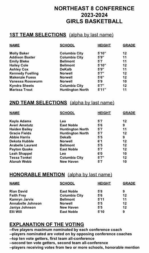 (2-5-24) The Northeast 8 Conference (NE8) announced its 2024 All-Conference girls basketball team.