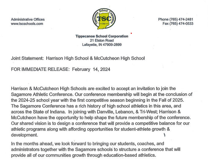 (2-14-24) A year ago this coming April Harrison and McCutheon were voted out of the North Central Conference, today they find a new athletic conference home…the Sagamore Athletic Conference. The two schools will join the conference in the Fall of 2025