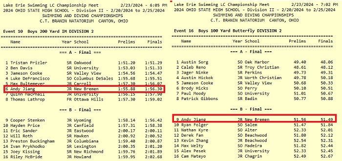 (2-23-24) Celina’s Jackson Newcomb and New Bremen’s Andy Jiang finished up this year’s OHSAA D II Swim Championships in two finals tonight in Canton.
