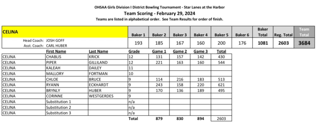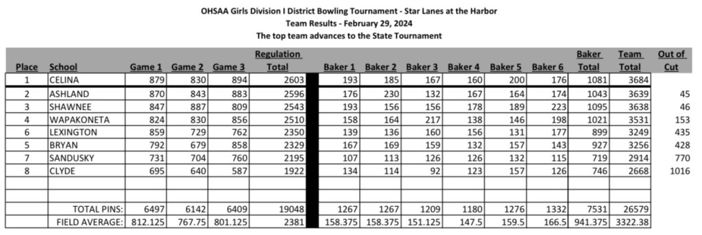 (3-1-24) The Celina Girls bowling team won the D I District title yesterday and advanced to the OHSAA State Championships in Columbus for the first time in school history.