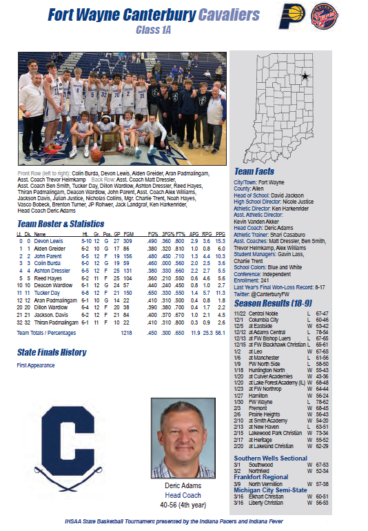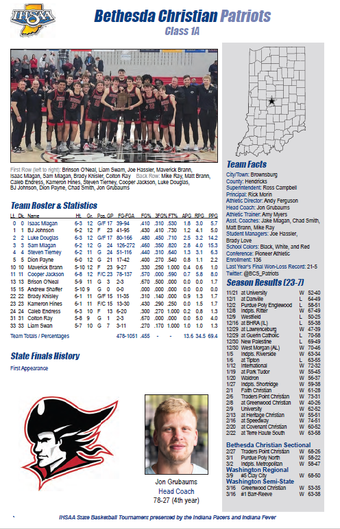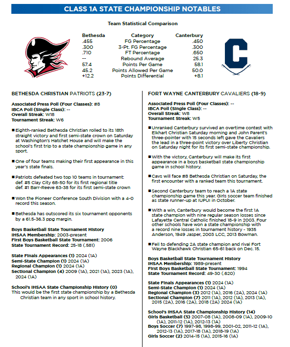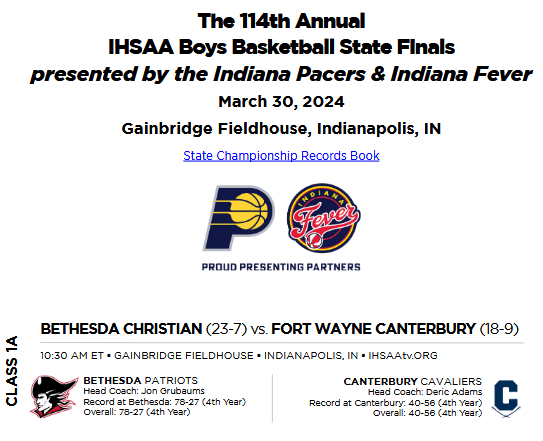 (3-21-24) A first time Indiana State Boys Basketball Champion will be crowned when Bethesda Christian and Canterbury play for the 1A title. The two teams have an extra week to prepare for the title game, which is the first time for a two week break between the semistate and the state final game.