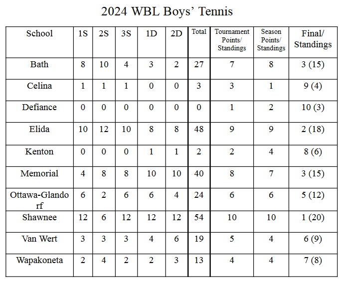 1. Shawnee 20, 2. Elida 18, 3. St. Marys 15, 3. Bath 15, 5. Ottawa-Glandorf 12, 6. Van Wert 9, 7. Wapakoneta 8, 8. Kenton 6, 9. Celina 4, 10. Defiance 3