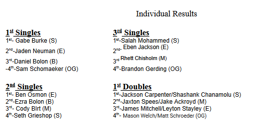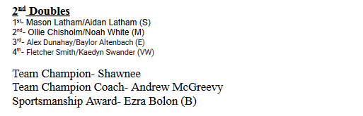 Shawnee picked up four out of the five individual tiles, Gabe Burke (1st singles), Salah Mohammed (3rd singles), Jackson Carpenter and Shashank Chanamolu (1st doubles) and Mason Latham and Aidan Latham (2nd doubles).