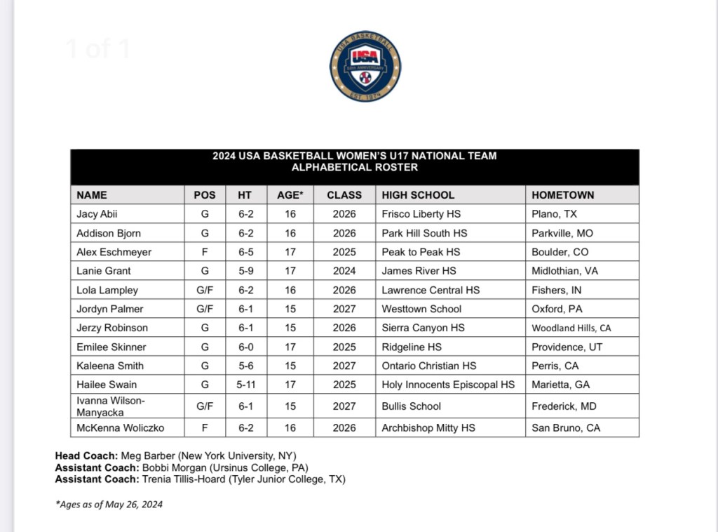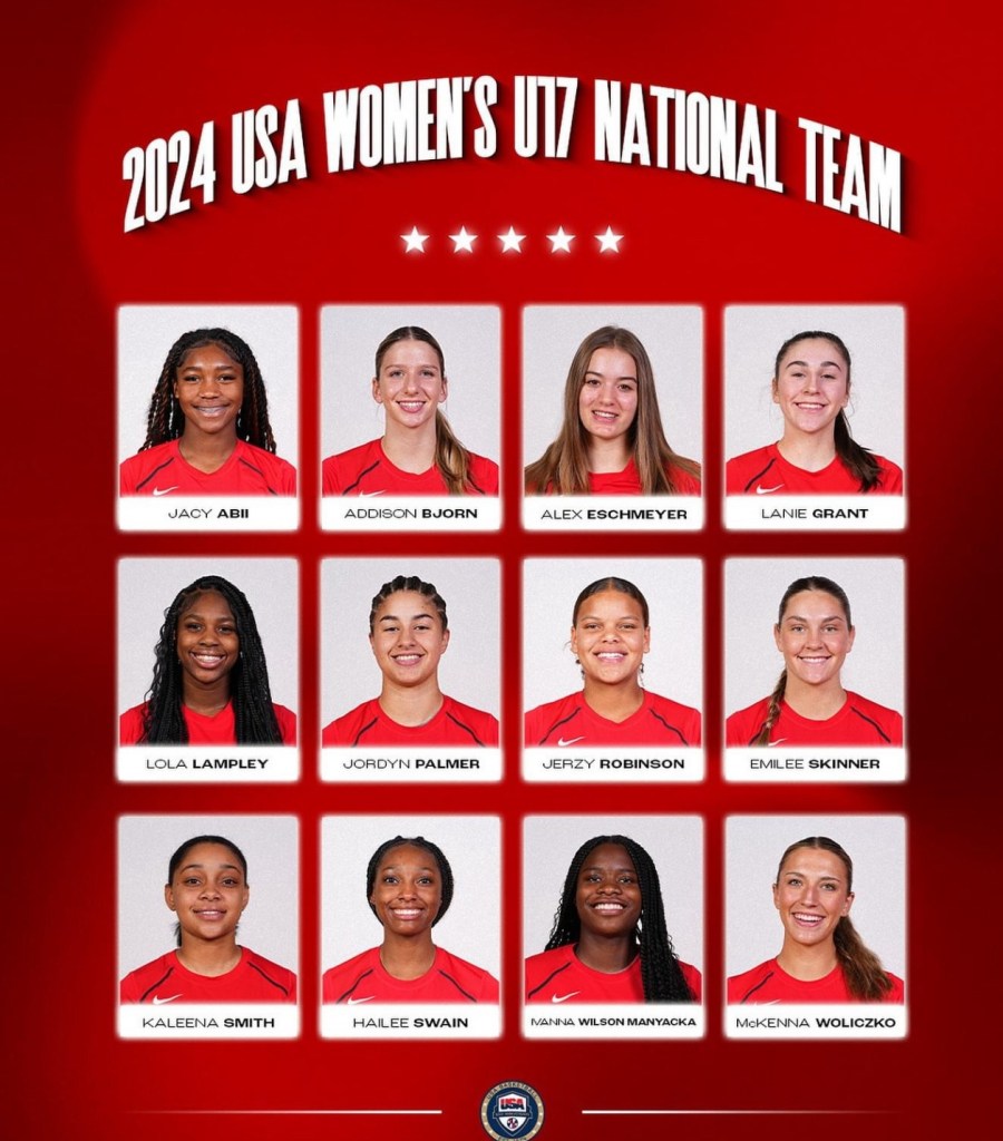 The 2024 Women’s U17 National Team includes Jacy Abii, Addison Bjorn, Alexandra Eschmeyer, Lanie Grant, Lola Lampley, Jordyn Palmer, Jerzy Robinson, Emilee Skinner, Kaleena Smith, Hailee Swain, Ivana Wilson-Manyacka and McKenna Woliczko.